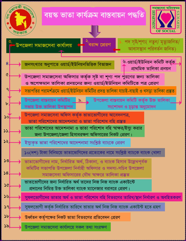 ১. বয়স্কভাতা - ইউনিয়ন পরিষদ এবং উপজেলা পরিষদ বাস্তবায়ন কমিটির অনুমোদনের মাধ্যমে। ভাতাভোগীর বয়স পুরুষের ক্ষেত্রে কমপক্ষে ৬৫ বছর এবং মহিলার ক্ষেত্রে কমপক্ষে ৬২ বছর হতে হবে।
